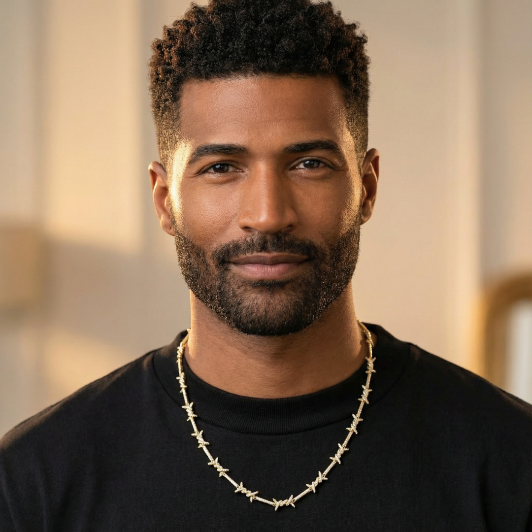 Introducing the "Iced Barbed Wire" chain in Gold. Meticulously crafted to look like real barbed wire, this chain is not just a piece of jewelry—it's a bold statement. Each link is custom-designed and expertly molded, capturing the essence of barbed wire with an edgy, contemporary twist. It's decked out with shiny stones set by hand, making it really stand out.