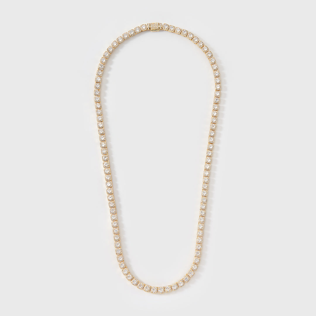 Introducing the 5mm gold micro clustered tennis chain, A must have in your collection. With hand-set stones, carefully placed surrounding the round-cut center stone, it's got the perfect amount of ice. This chain is great whether you wear it on its own or stack it with other chains.