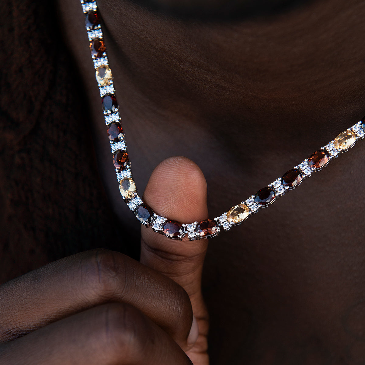 Step up your jewelry game with the Multicolor Mixed Oval Cut Tennis Tonal Brown Stones Chain in 5mm. This exclusive piece features various brown colored hand-set stones, set in an oval cut pattern and finished in 14k White Gold. Perfect for elevating any outfit and adding a touch of personality to your style. Layer two together to make a bold statement!