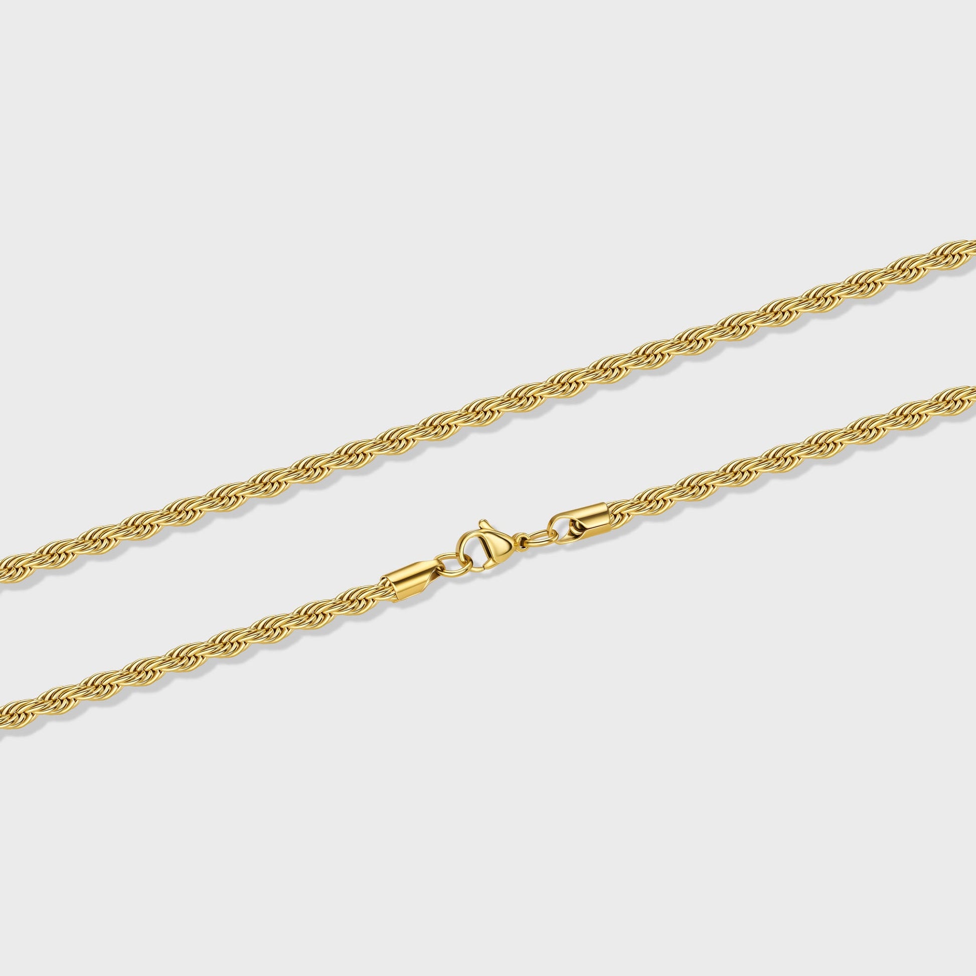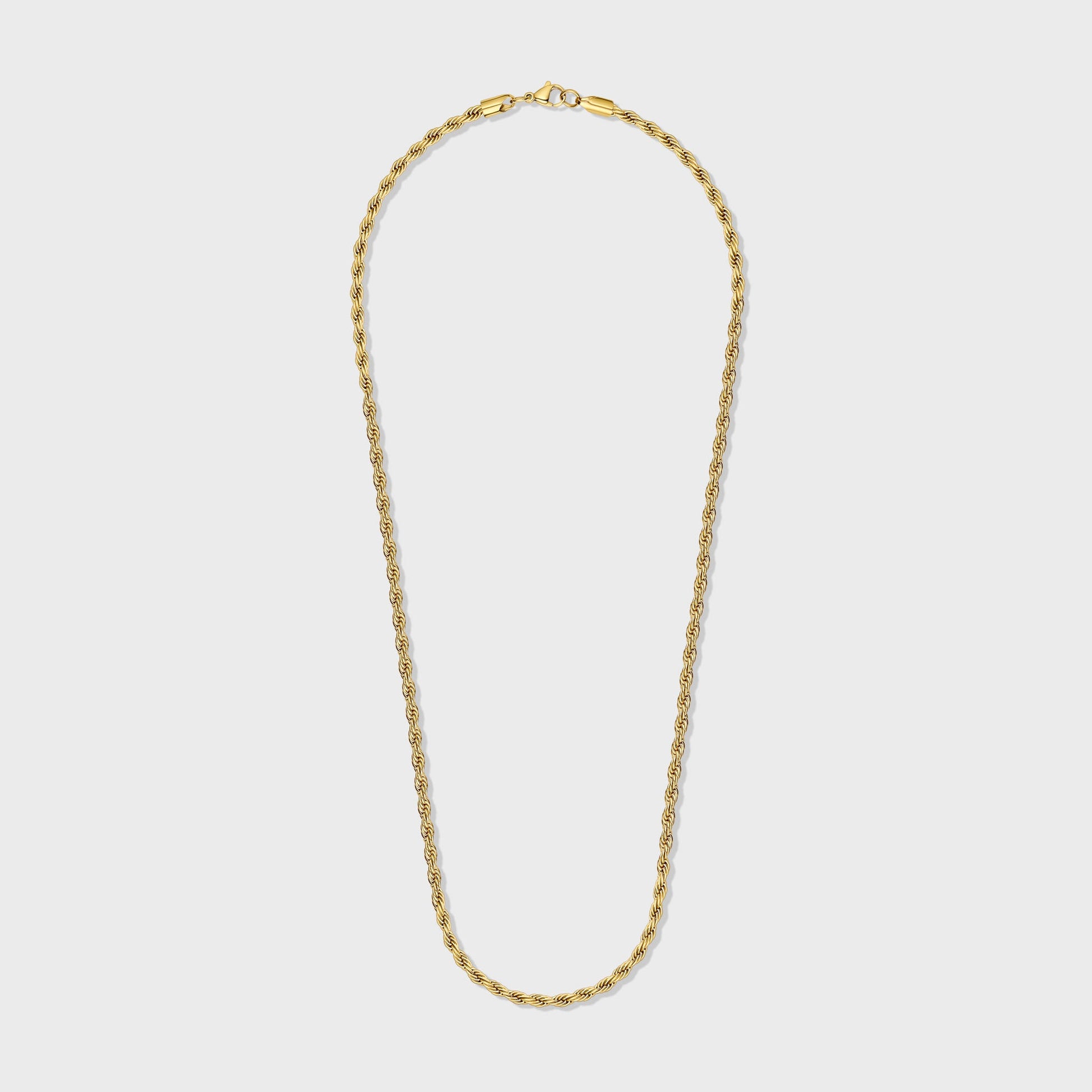 The 4mm gold rope chain is the ultimate statement piece for those who appreciate bold and timeless style. Handcrafted from the finest materials, this chain boasts an intricate design that offers the perfect combination of strength and flexibility. Its smooth and sleek texture makes it a true pleasure to wear, while its classic design ensures that it will never go out of style. Whether you're dressing up or keeping it casual, the gold rope chain is the perfect accessory to take your look to the next level. Made with Real 18K Gold Bonded.