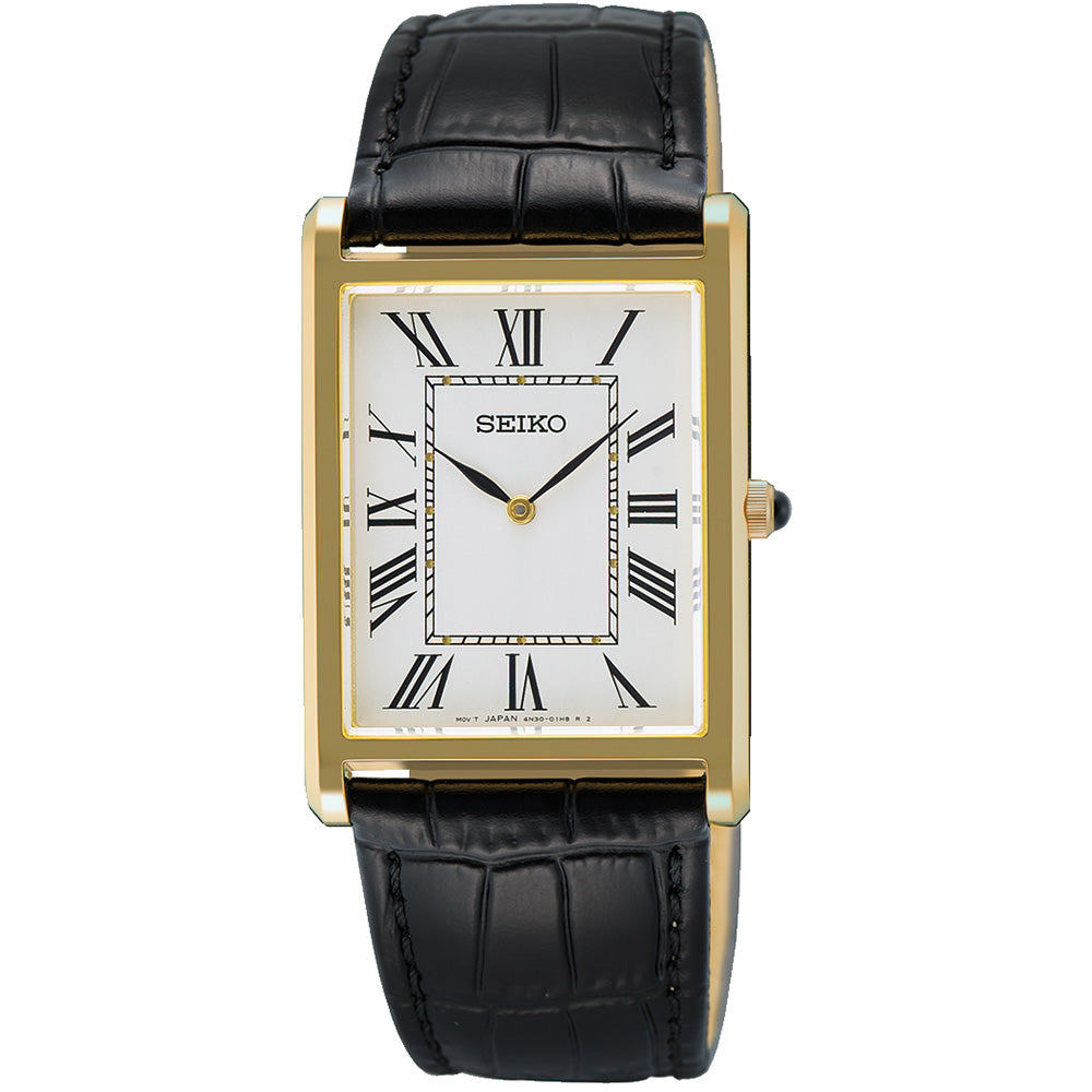The Seiko SWR104P offers a timeless and elegant look with its sleek rectangular design. It features a crisp white dial adorned with classic black Roman numerals, all encased in a 39 x 27.2mm gold-plated stainless-steel case.Paired with a black leather strap for a refined finish, this watch is powered by the dependable Calibre 4N30 quartz movement. With 50 meters water resistance, it blends vintage-inspired style with everyday functionality.- Calibre 4N30- 39x27.2mm Case Size - Stainless Steel Case - Leather Strap - 50 Meters Water Resistant